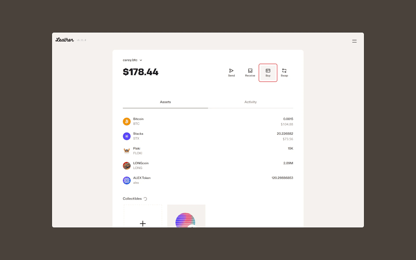 Transfer to Leather: Send Bitcoin to your Leather wallet for safe storage.