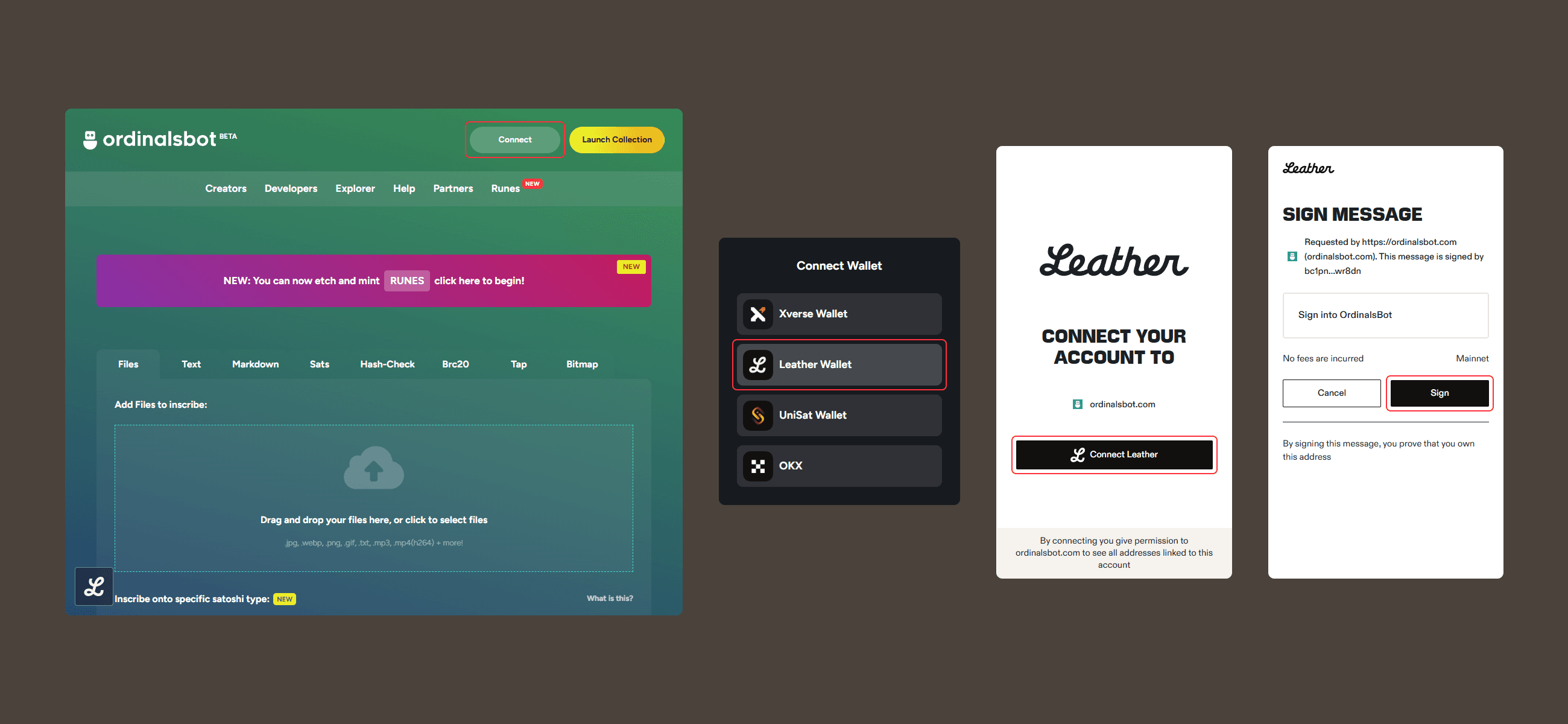 Leather users can connect to OrdinalsBot to mint Ordinals and Runes, conduct additional transactions with BRC-20 tokens, and more.